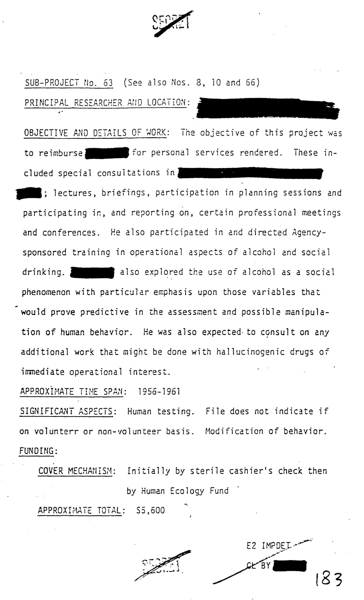 MKULTRA Subproject 56: Alcohol Research – Determining effectiveness of food in delaying alcohol absorption; effectiveness of sympathominetic drugs in delaying absorption; develop a test of alcohol tolerance.